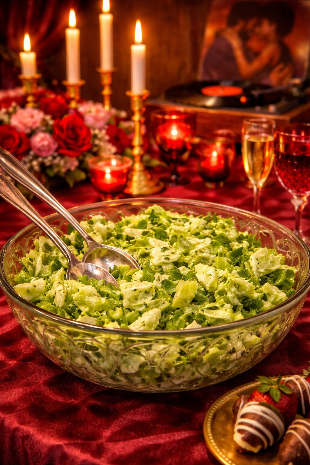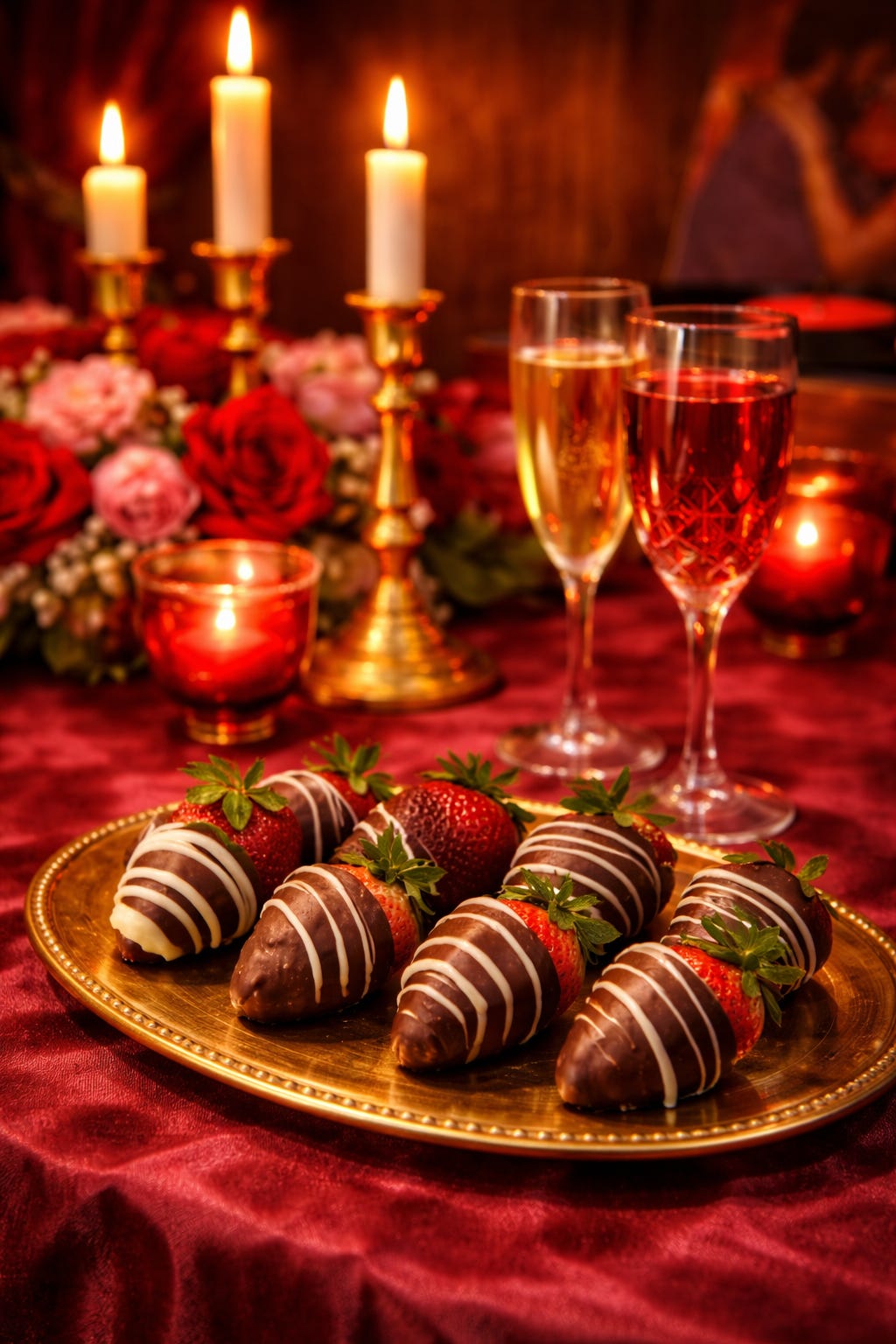 And for dessert, chocolate-dipped strawberries. No fancy decorations. Just glossy chocolate and delicious fresh fruit. Simple. Intentional. Romantic without trying too hard.